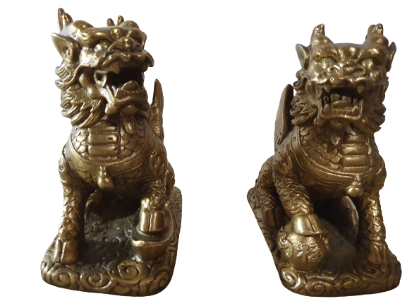 Replici de calitate ale unor simboluri feng shui vechi de peste 5000 de ani din traditia poporului chinez; apara si protejeaza casa sau biroul de energii negative, furturi, accidente si oameni cu intentii necurate. Functioneaza doar in pereche. Se amplaseaza cu fata spre intrarea principala in imobil la o inaltime cuprinsa intre genunchi si barbia sefului casei ori al afacerii.
